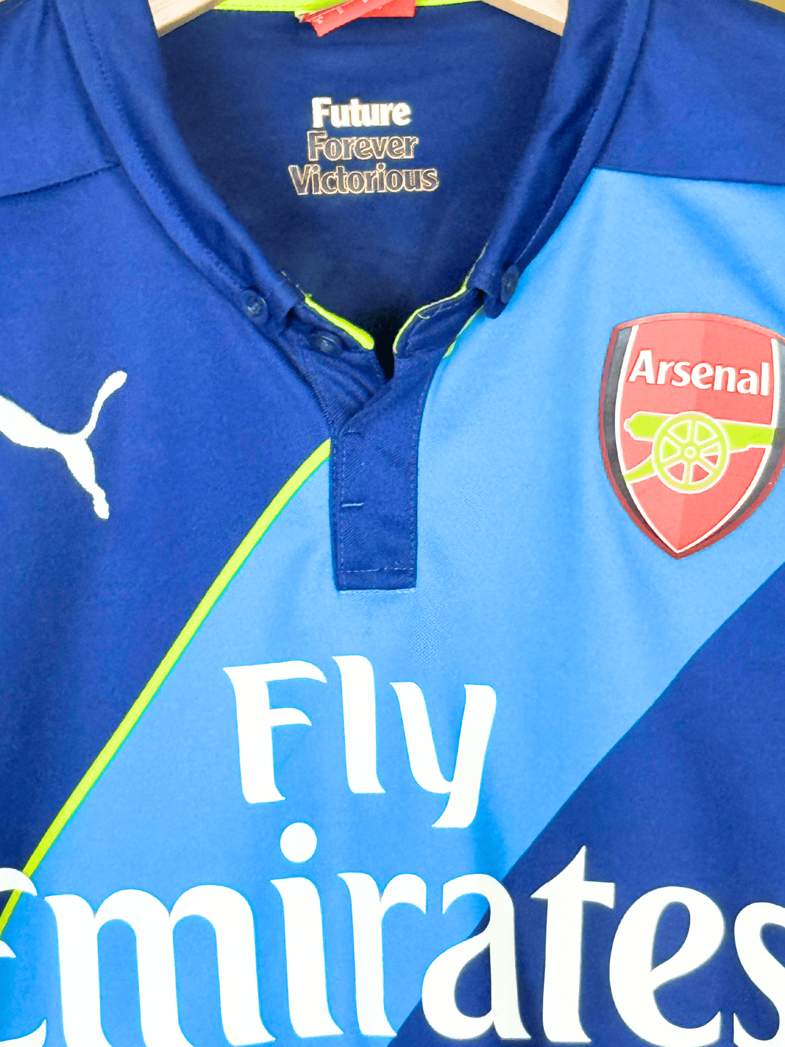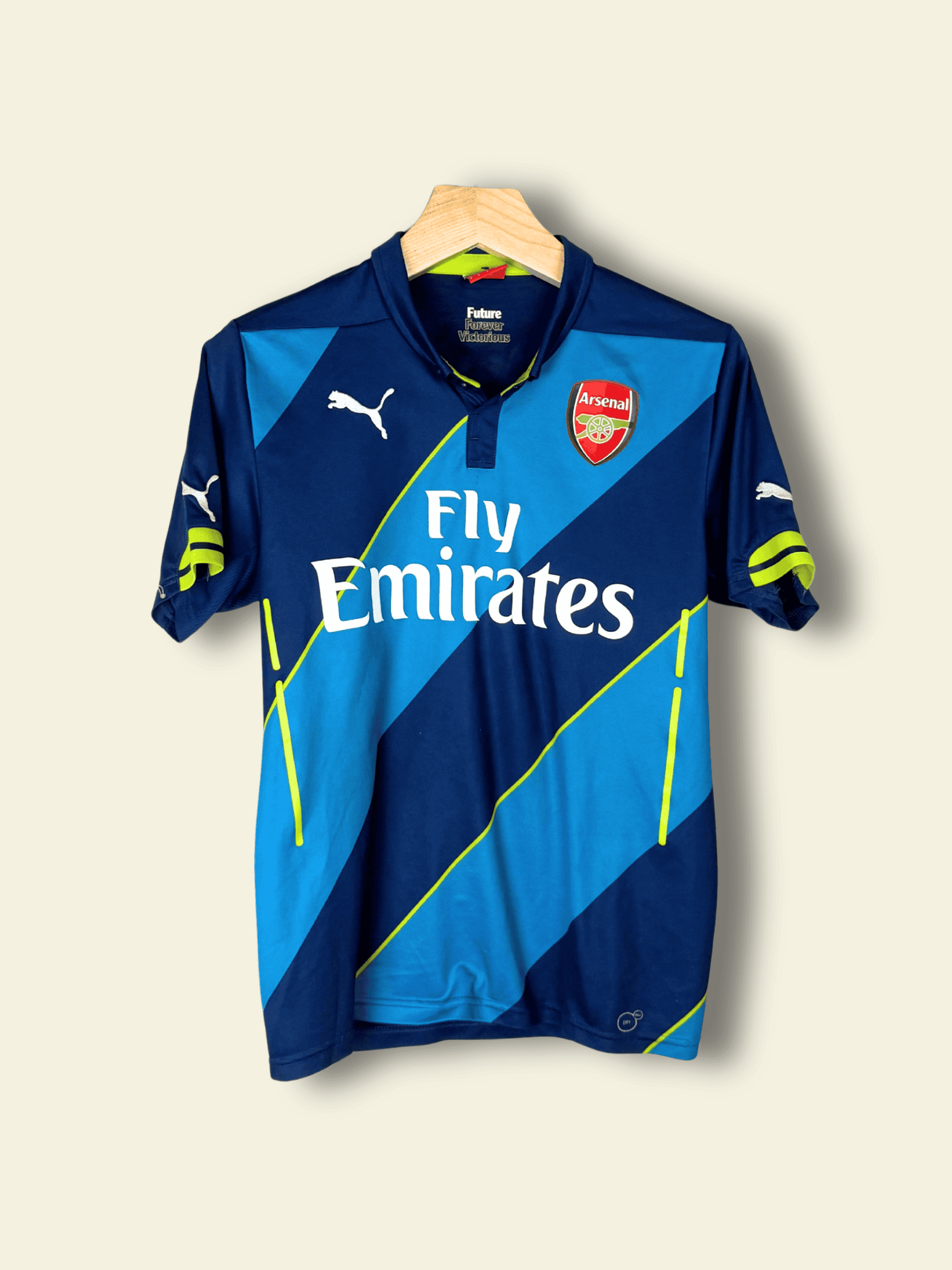 The 2014–15 season saw Arsenal, under Arsène Wenger, continue to re-establish themselves as a consistent top-four side while adding another trophy to their cabinet. The team finished 3rd in the Premier League, securing direct qualification to the Champions League. In domestic cup action, Arsenal successfully defended their FA Cup, beating Aston Villa 4–0 in the final at Wembley, with an emphatic performance. Lukas Podolski featured in the first half of the season but found playing time limited, eventually moving on loan to Inter Milan in January 2015. The squad’s depth, combined with the form of players like Alexis Sánchez, Santi Cazorla, and Olivier Giroud, allowed Arsenal to compete strongly, though they fell in the Champions League Round of 16 to AS Monaco.