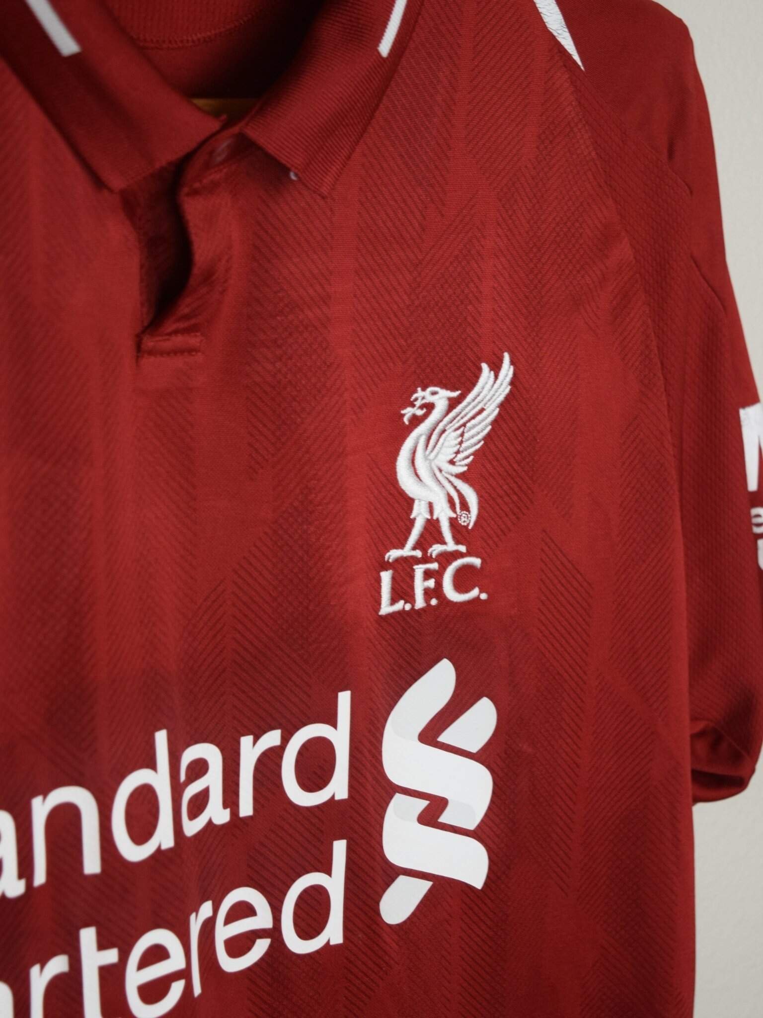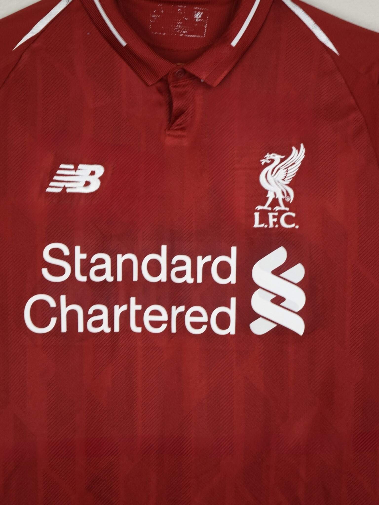 The 2018 Liverpool Home Jersey, made by New Balance, was a rich deep red with white details, a retro-inspired design celebrating the club’s heritage. It featured a buttoned Henley-style collar, paying homage to Liverpool’s kits of the 1980s.