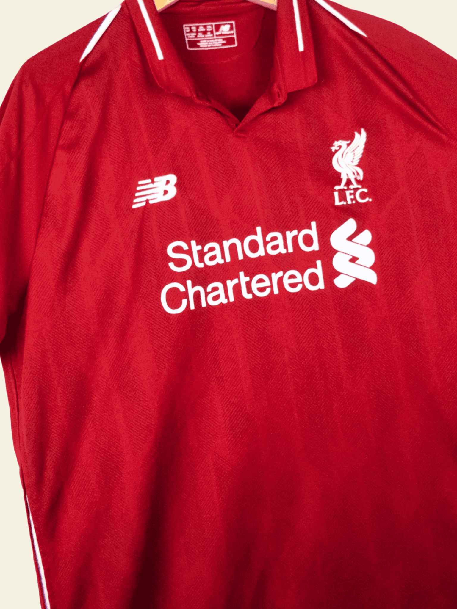 The 2018 Liverpool Home Jersey, made by New Balance, was a rich deep red with white details, a retro-inspired design celebrating the club’s heritage. It featured a buttoned Henley-style collar, paying homage to Liverpool’s kits of the 1980s.
