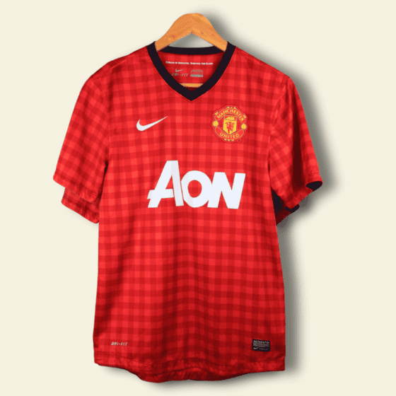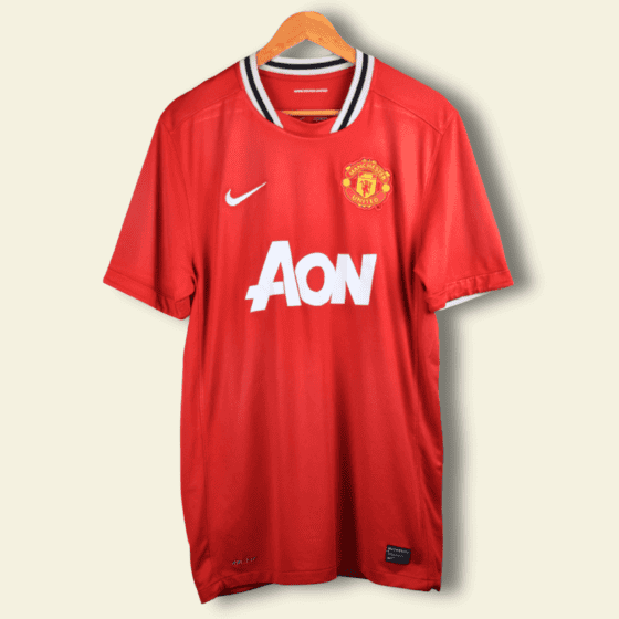 The 2010–11 Manchester United home kit, produced by Nike, was modern yet symbolic. It featured a classic red body, a black V-neck collar, subtle black trim, and the AON sponsor — the first home shirt to carry the brand. Clean and aggressive, the kit is forever associated with United’s return to the top of English football and the attacking flair of players like Nani.