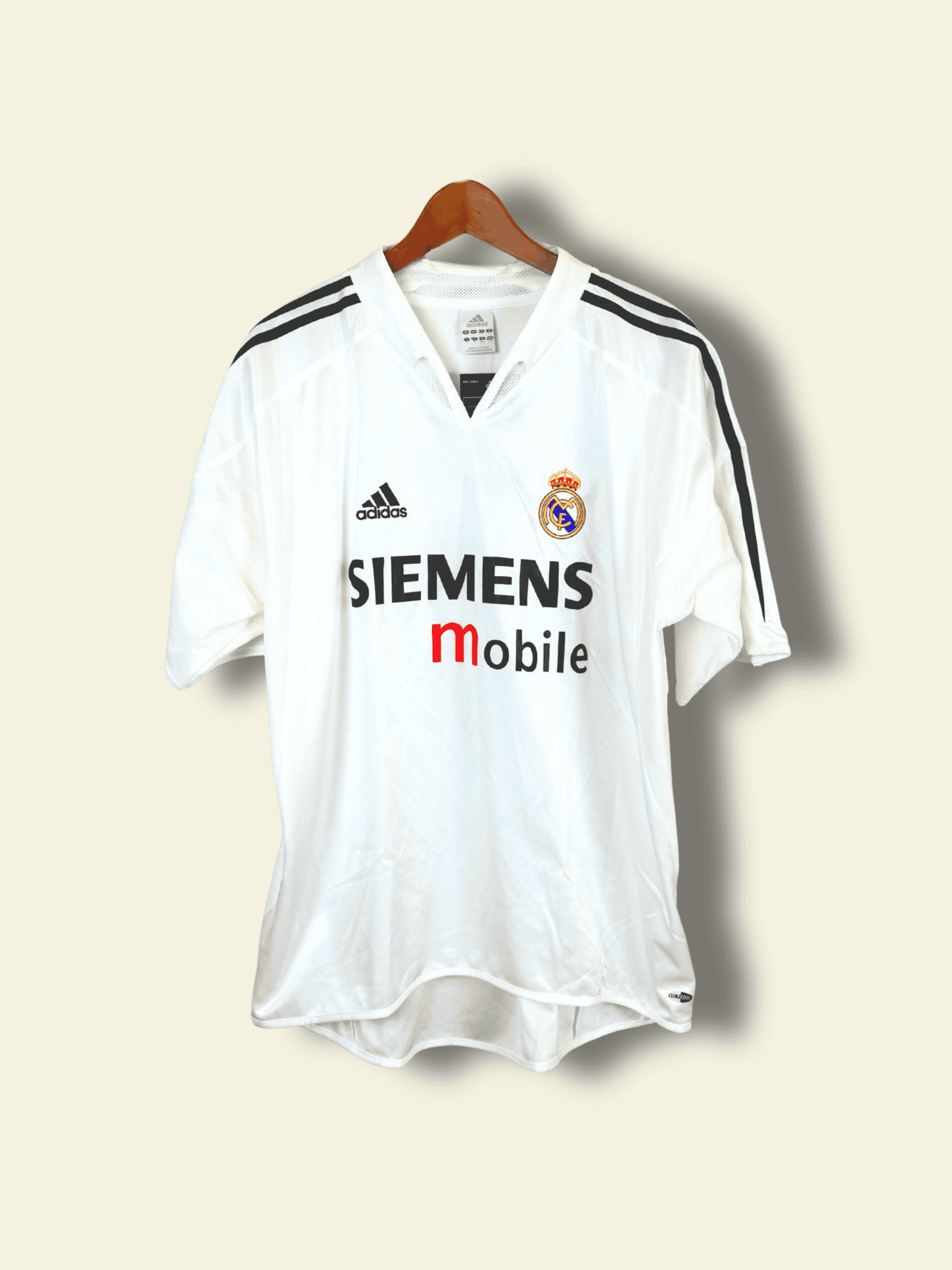 The 2005–06 Real Madrid home kit, produced by adidas, remained true to tradition with a clean white base, black and silver accents, and the Siemens Mobile sponsor. Elegant and minimalist, the shirt is now considered a classic vintage football shirt from the twilight of the Galácticos era.