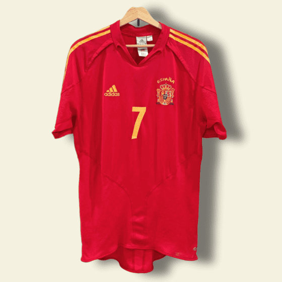 The 2004 Spain home kit, produced by adidas, featured a classic deep red base, gold detailing, and a clean, traditional cut. Minimalist and elegant, it reflected Spain’s historical identity while unknowingly dressing the early architects of the tiki-taka era. Today, it stands as a highly collectible vintage football shirt tied to the dawn of a golden generation.