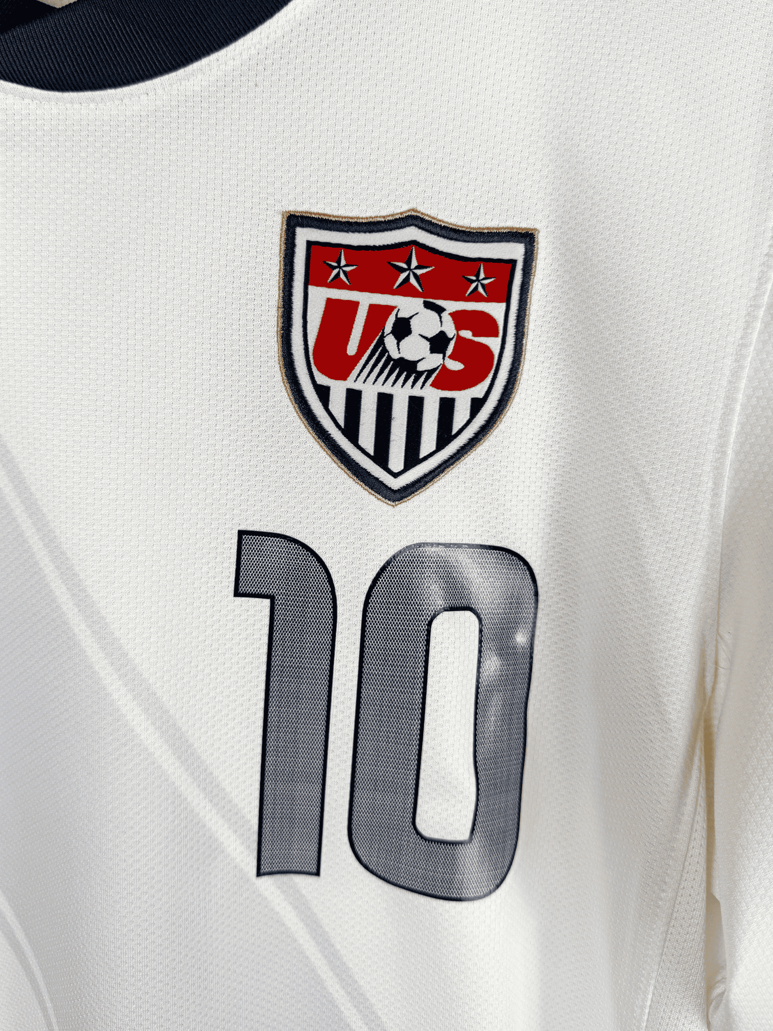 The 2010 USA home kit, produced by Nike, featured a clean white base, subtle navy and red pinstripes, and a classic polo-style collar. Minimalist and traditional, the shirt became inseparable from the team’s dramatic group-stage triumphs and is now regarded as a defining vintage football shirt in U.S. soccer history.